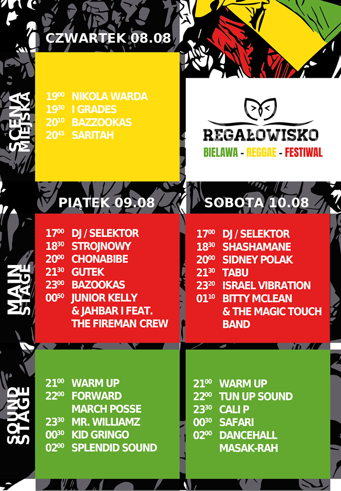 Festiwal Regałowisko w Bielawie to jeden z najstarszych festiwali plenerowych z muzyką reggae w Polsce. XXI edycja tej imprezy to świadectwo ciągłego rozwoju oraz elastyczności festiwalu pod kątem muzycznym, dzięki czemu przez tyle lat Regałowisko istnieje na polskiej mapie festiwalowej. Jak co roku, poza doskonałym składem muzycznym, czekają na Was szczegółowo wyselekcjonowane sceny prezentujące