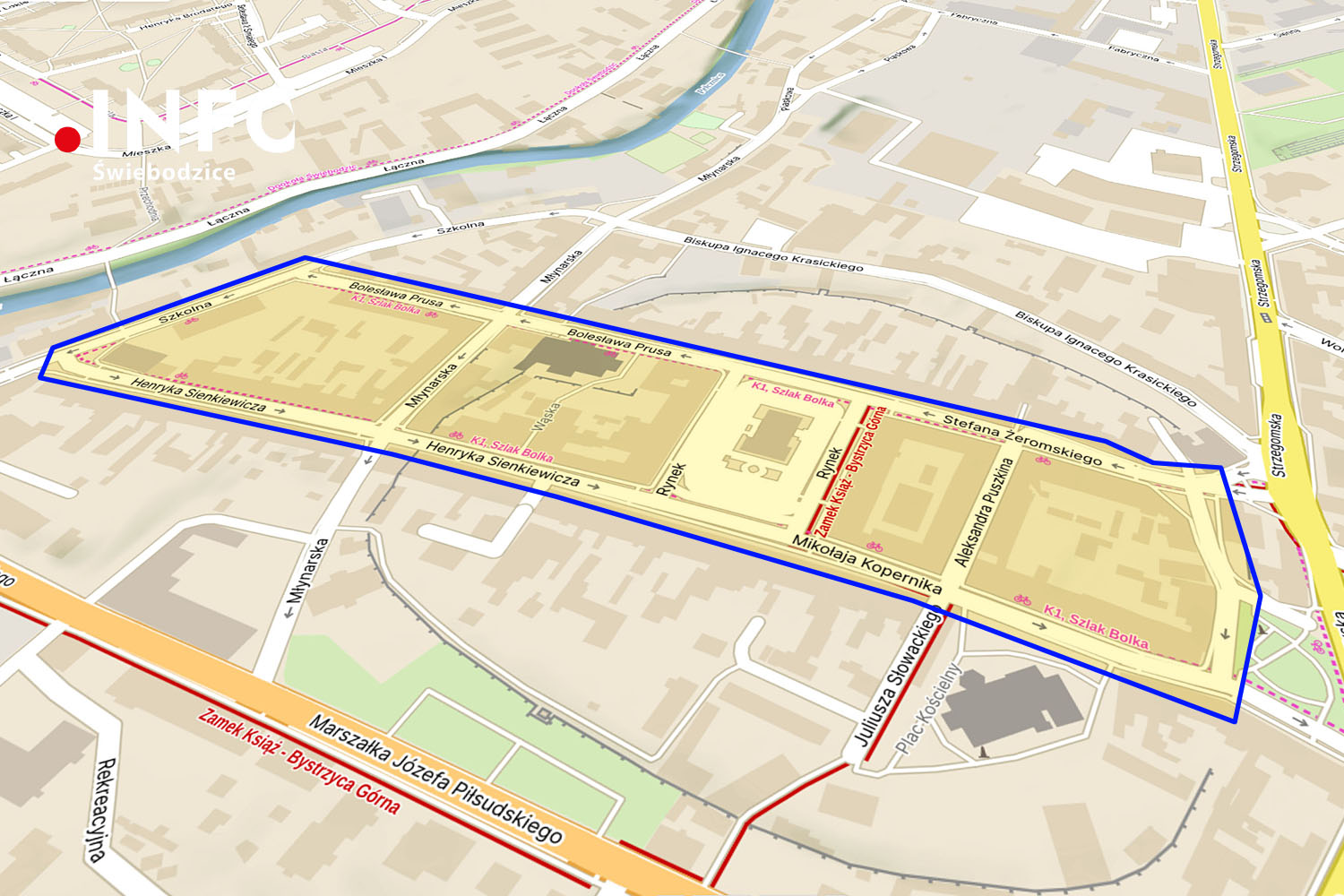 ul. Prusa, Kopernika i Sienkiewicza – do skrzyżowań z Rynkiem i Placem Jana Pawła II,