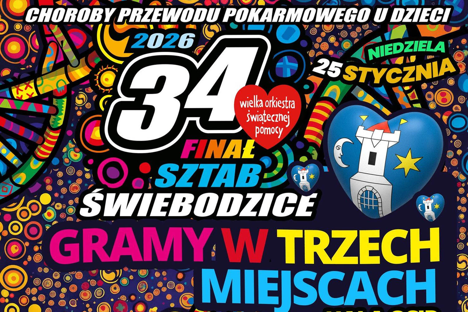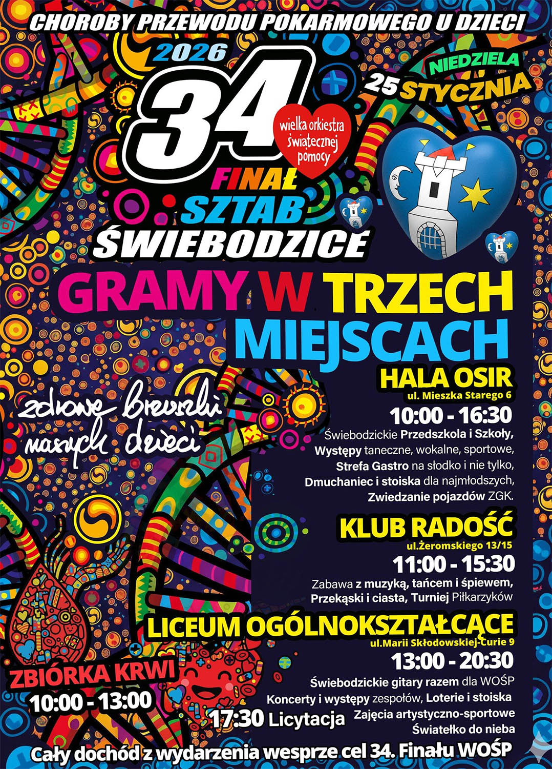 Obchody rozpoczną się w niedzielę, 25 stycznia o godzinie 10:00 w hali OSiR Świebodzice sp. z o.o. Na uczestników czekać będą stoiska z domowymi ciastami i ciepłym jedzeniem, animacje dla dzieci, pokazy pierwszej pomocy oraz strefa doświadczeń. Zaplanowano także występy artystyczne, możliwość obejrzenia pojazdów ZGK, loterię, malowanie twarzy oraz dmuchańce. Wydarzenie w hali OSiR aktywnie wesprą żołnierze Wojsk Obrony Terytorialnej.