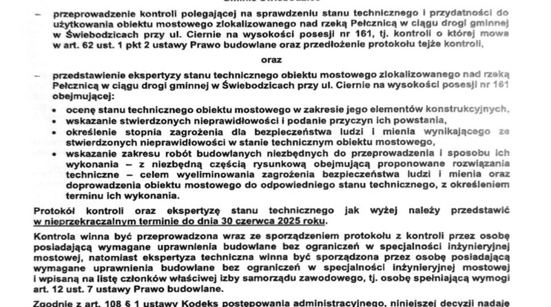 Pod koniec lipca br. most na rzece Pełcznica w Świebodzicach, w pobliżu nr 161 przy ul. Ciernie, został zamknięty decyzją nadzoru. Inspektor wydał decyzję o „natychmiastowym zakazie użytkowania mostu”. Obiekt, którego stan techniczny od dawna budził obawy, został wyłączony z ruchu z powodu realnego zagrożenia bezpieczeństwa. To gminne zaniedbania doprowadziły do paraliżu przeprawy.