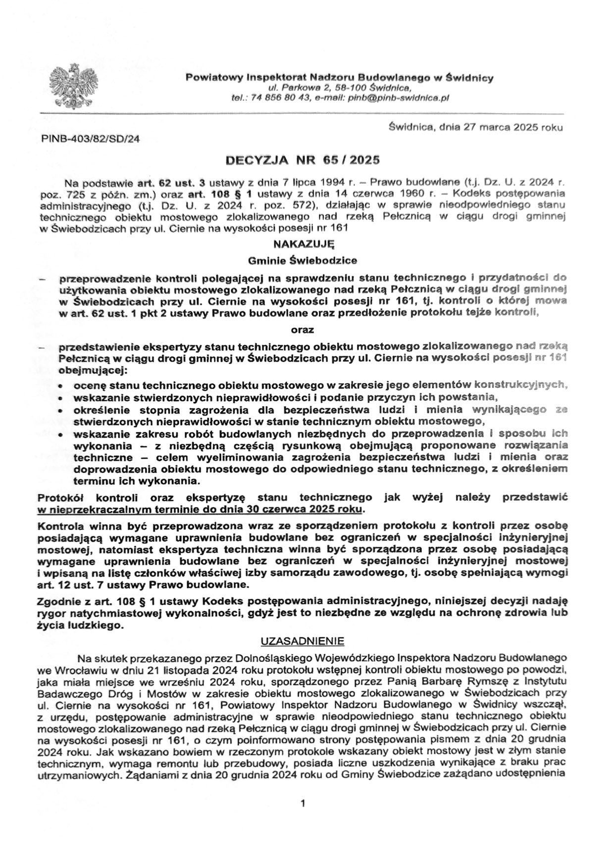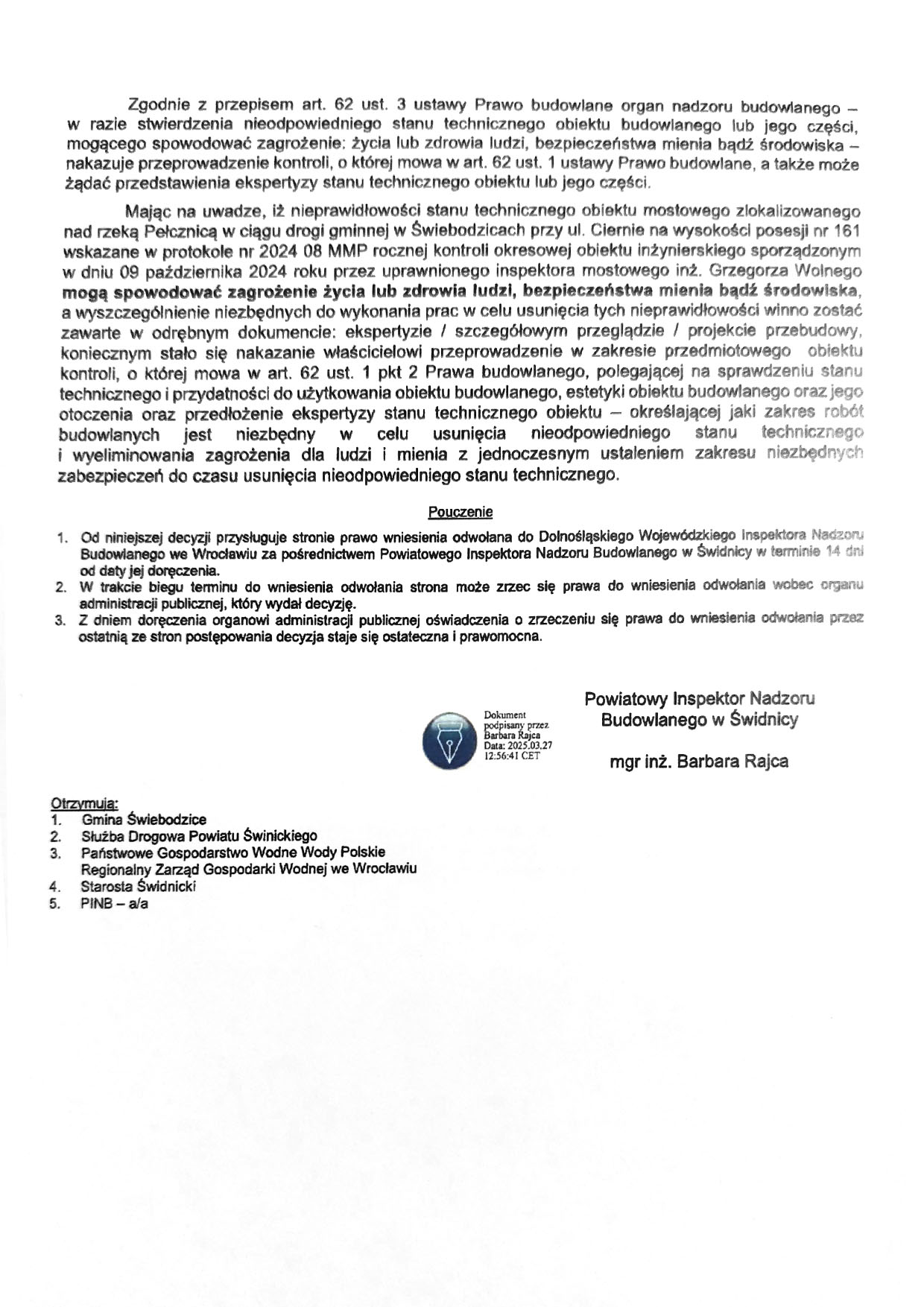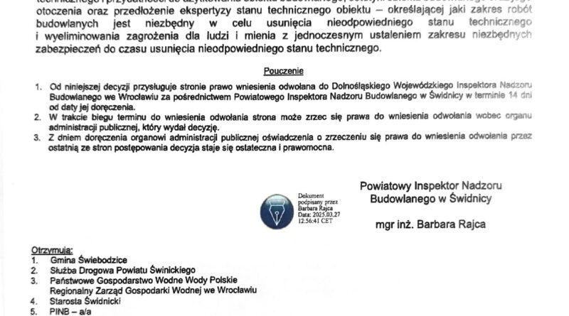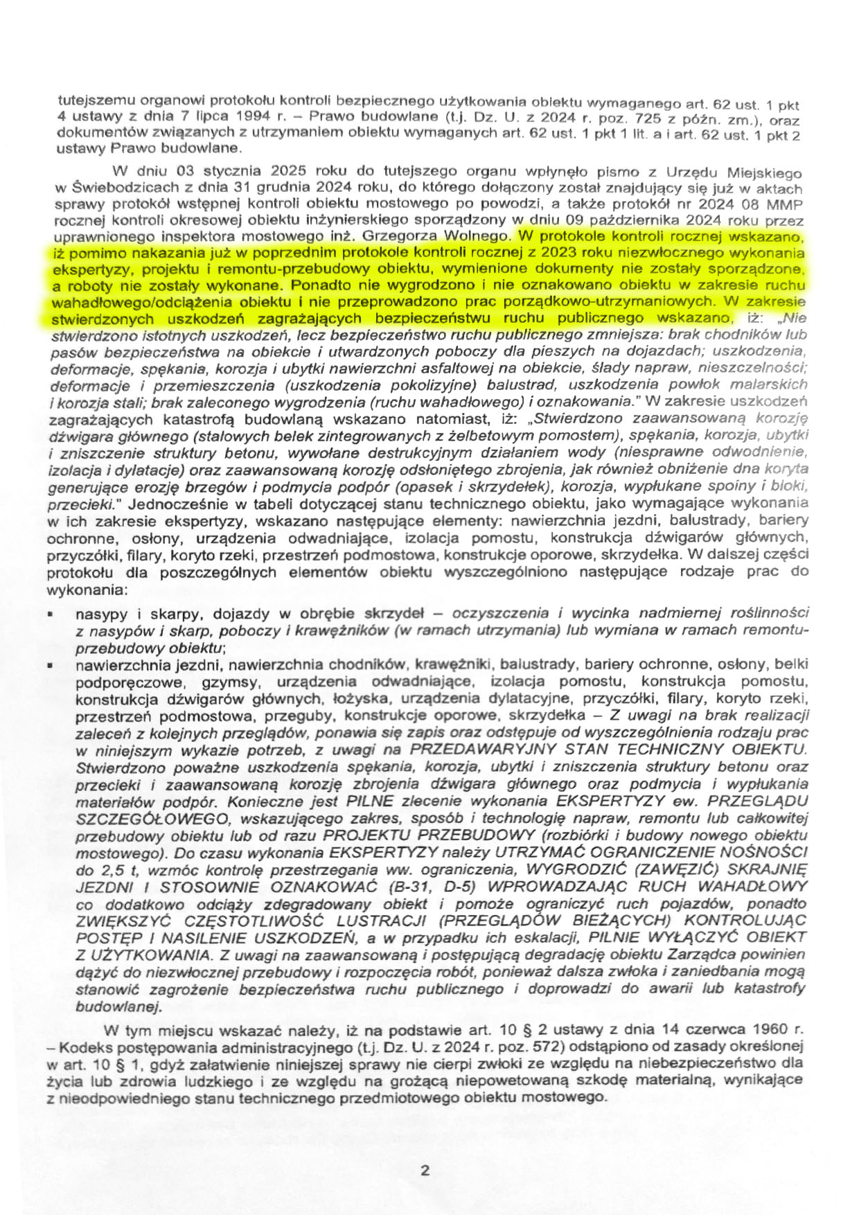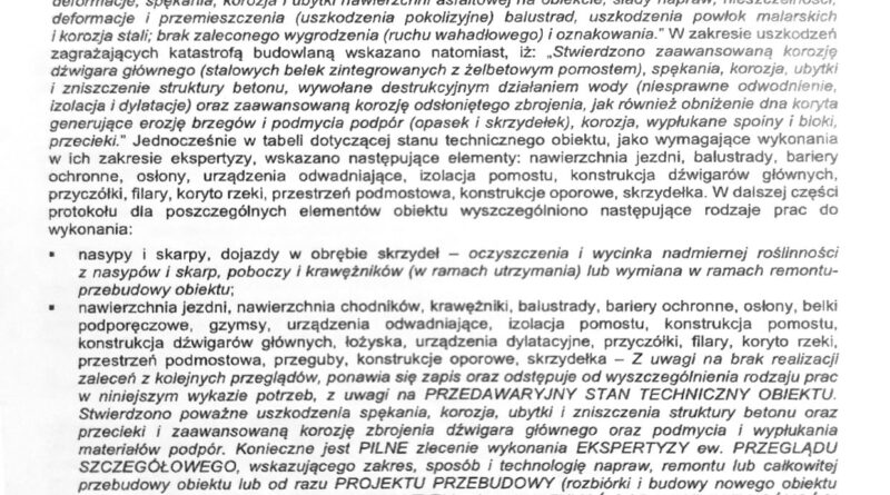 Zalecenia te miały zostać wykonane niezwłocznie. Jednak – jak podkreślono w późniejszych protokołach – do jesieni 2024 roku nie zrealizowano żadnego z wymienionych obowiązków. Nie powstała ekspertyza, nie przygotowano dokumentacji, a most nie został nawet tymczasowo zabezpieczony. Zaniechania te skutkowały narastającym zagrożeniem bezpieczeństwa ludzi, mienia i środowiska, co zostało podkreślone przez nadzór budowlany w decyzji z 27 marca 2025 r.